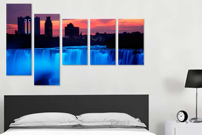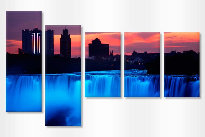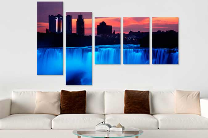 Tema - apa, albastru, cascada, apus, asfintit, cer, relax, decor interior, modern, living, dormitor, bucatarie, birou.